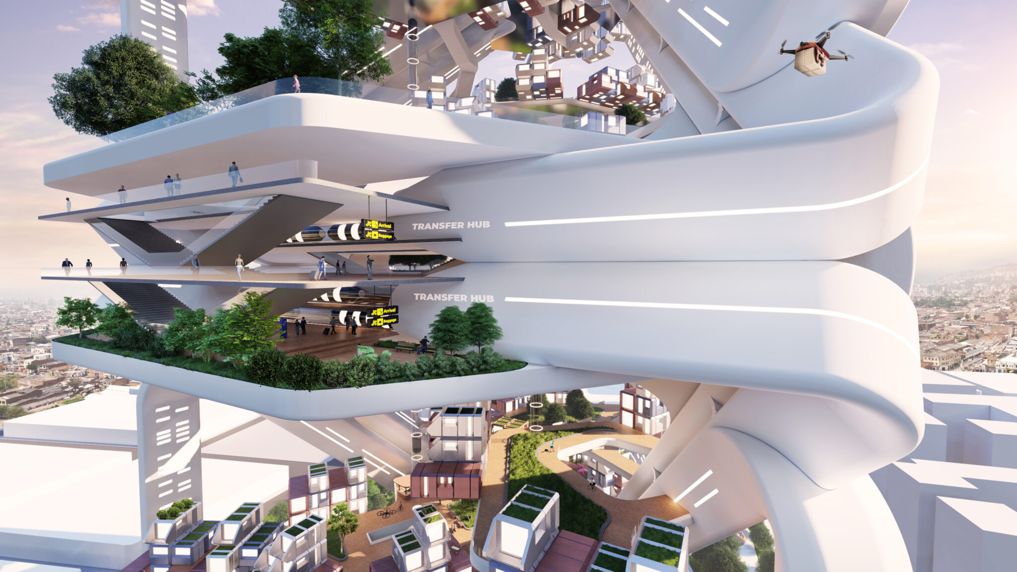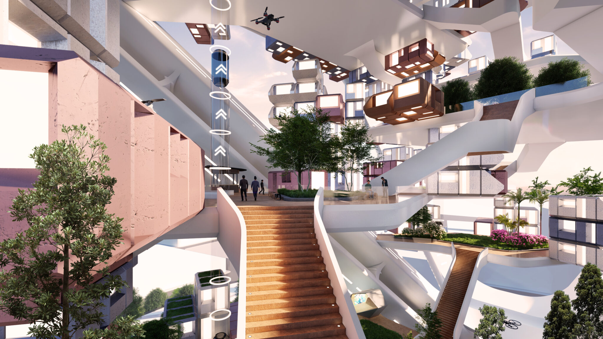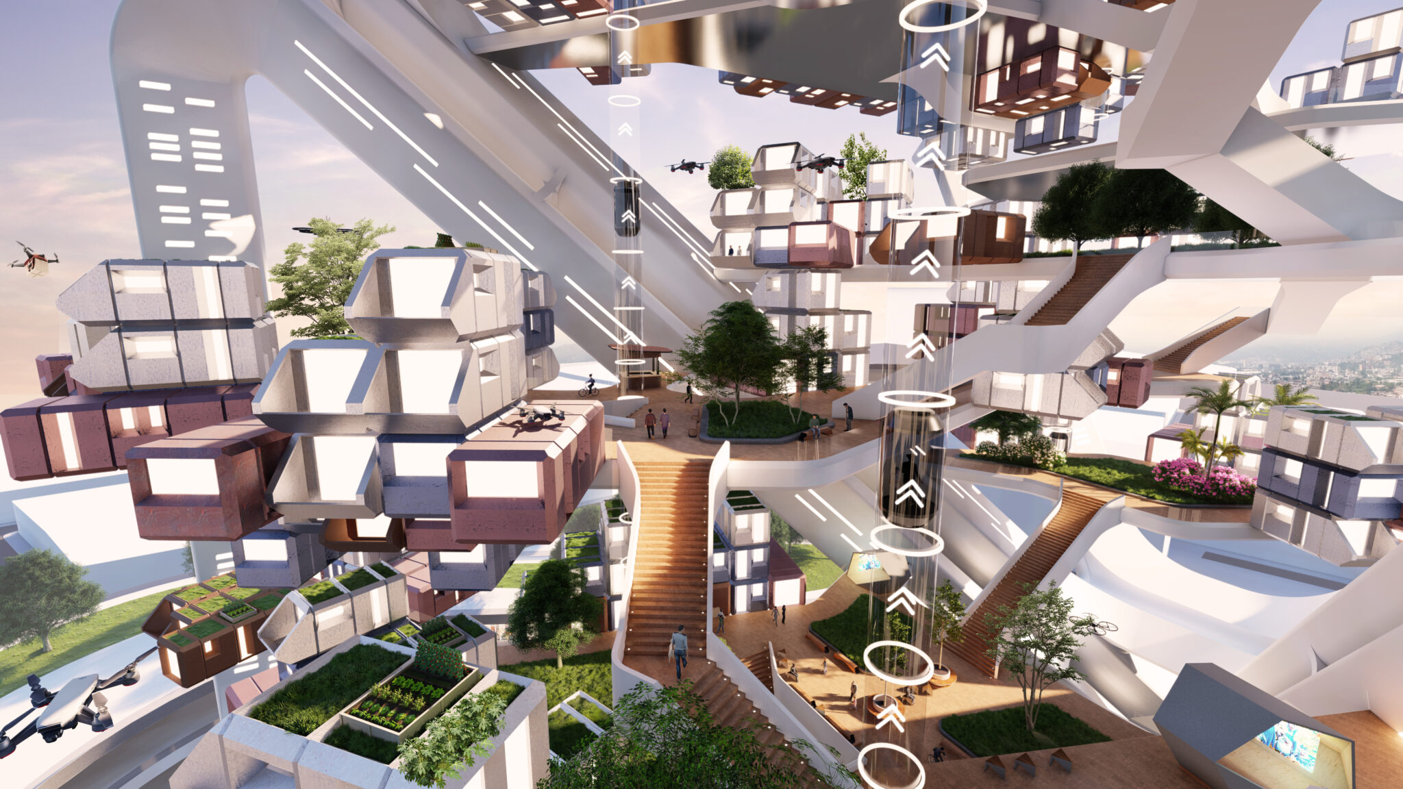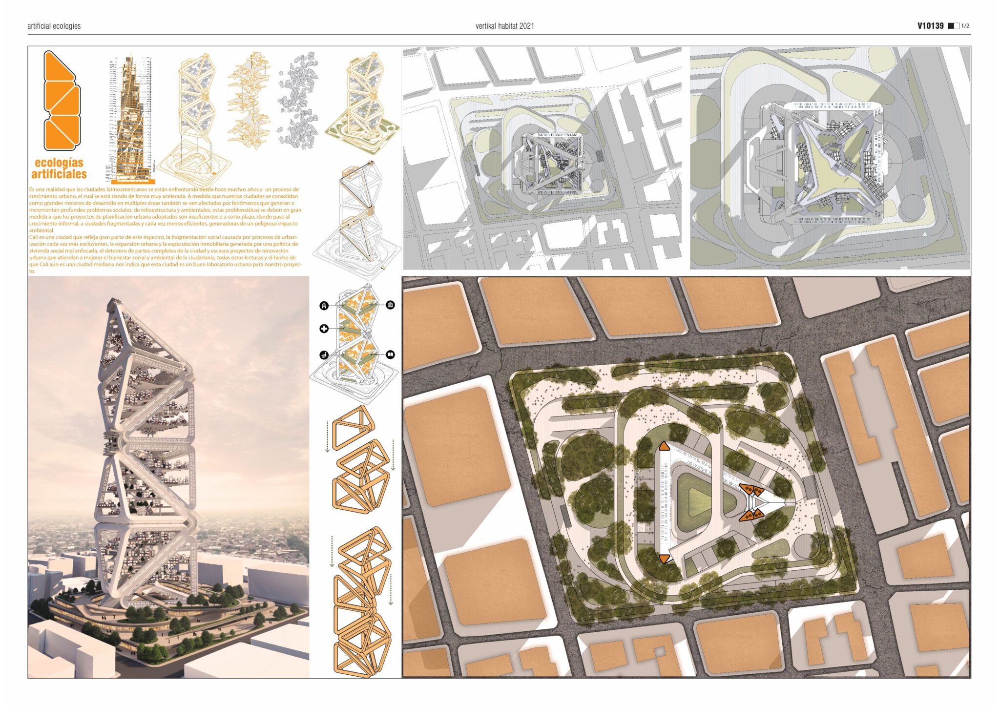 Vertikal Habitat representa un trabajo conceptual que busca repensar la ciudad cómo un hecho construido, que alejado del modelo de ciudad horizontal que se ha erigido alrededor de nuestro territorio, logre establecer los principios y sistemas estructurantes del conglomerado de diversidades que constituye un polo construido a través de la densificación. El resultado es un edificio cuya mega-estructura integra el sistema de transporte principal mediante una tecnología similar a los hyperloops, pero con un funcionamiento inclinado que lo diferencia. Esta mega-estructura, que es modular y ha sido construida mediante robots y dispositivos de impresión digital, incluye todos los equipamientos públicos necesarios, como hospitales, bibliotecas, escuelas y oficinas municipales, entre otros.