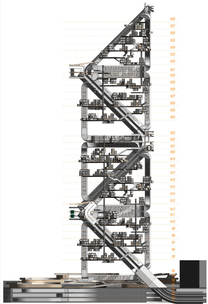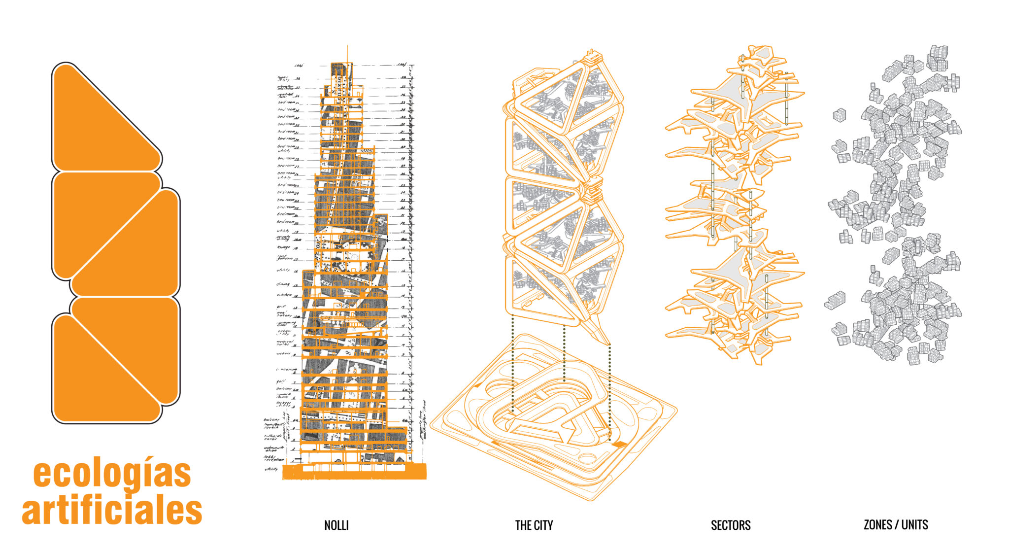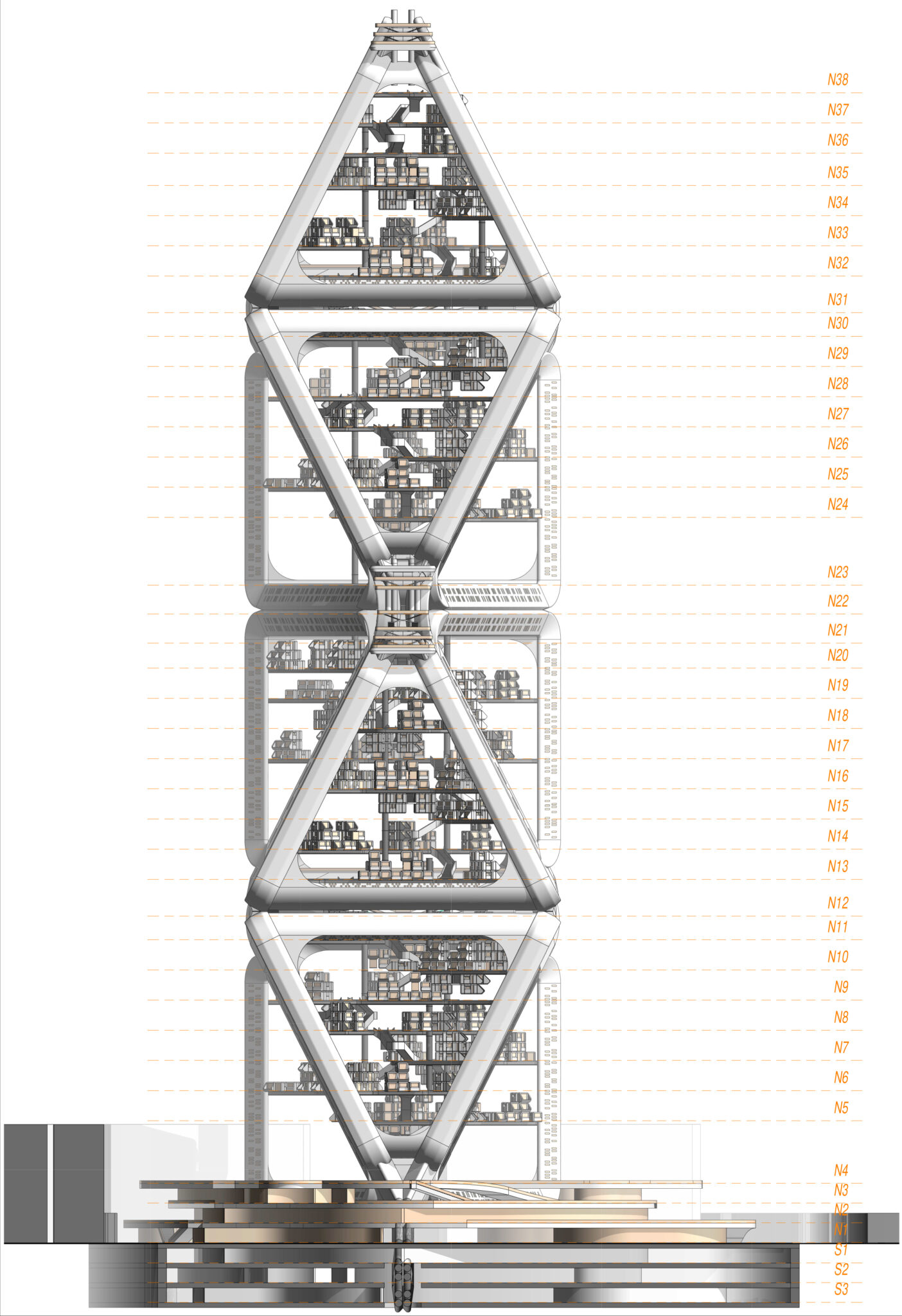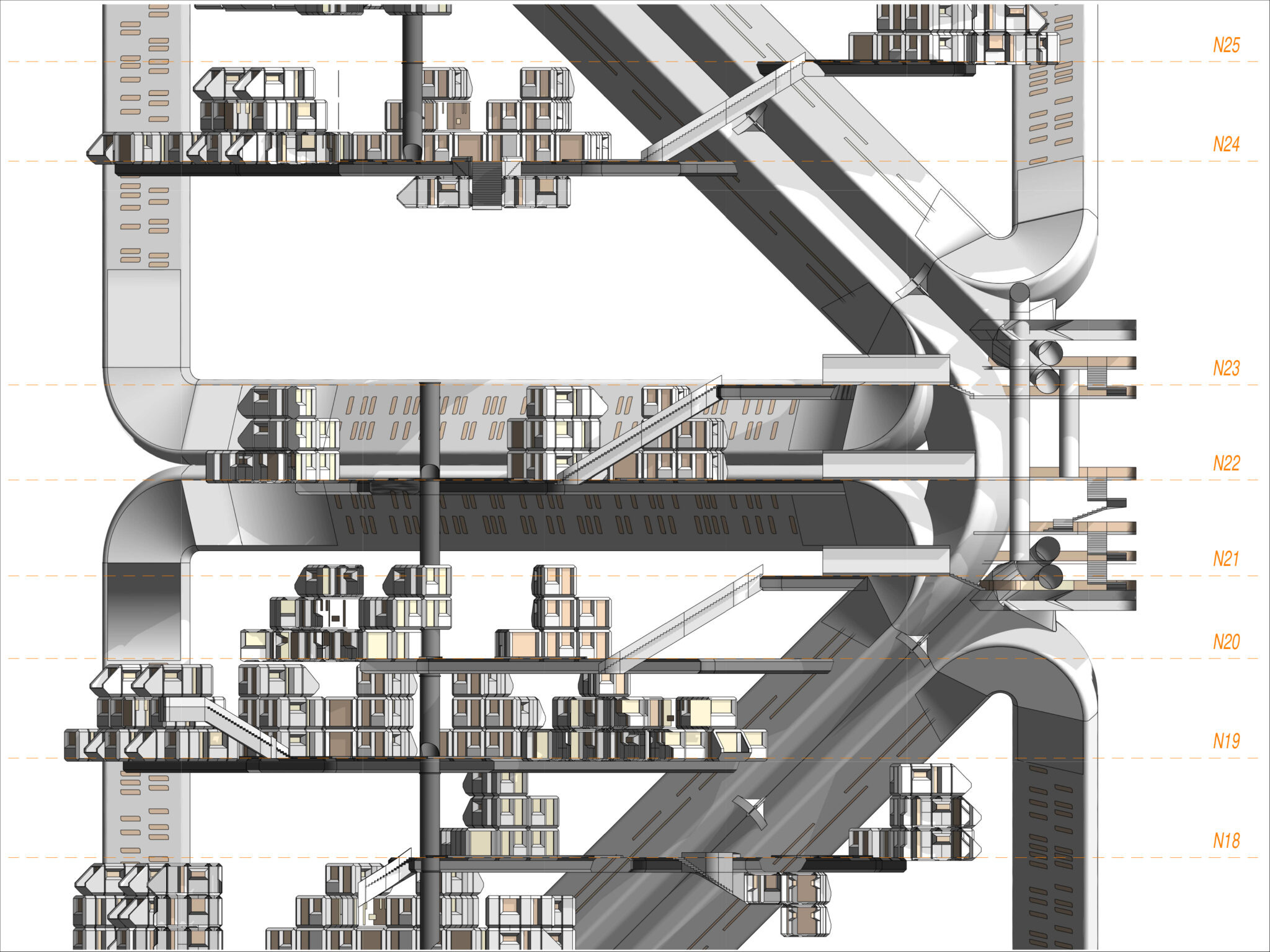 Vertical Habitat represents a conceptual work that seeks to rethink the city as a built fact. Far from the model of the horizontal city that has been erected around our territory, it aims to establish the principles and structuring systems of the conglomerate of diversities that constitute a built hub through densification. The result is a building whose megainfrastructure integrates the main transportation system through a technology similar to hyperloops, but with a distinctive inclined operation. This megainfrastructure, which is modular and has been built using robots and digital printing devices, includes all necessary public facilities such as hospitals, libraries, schools, and municipal offices, among other
