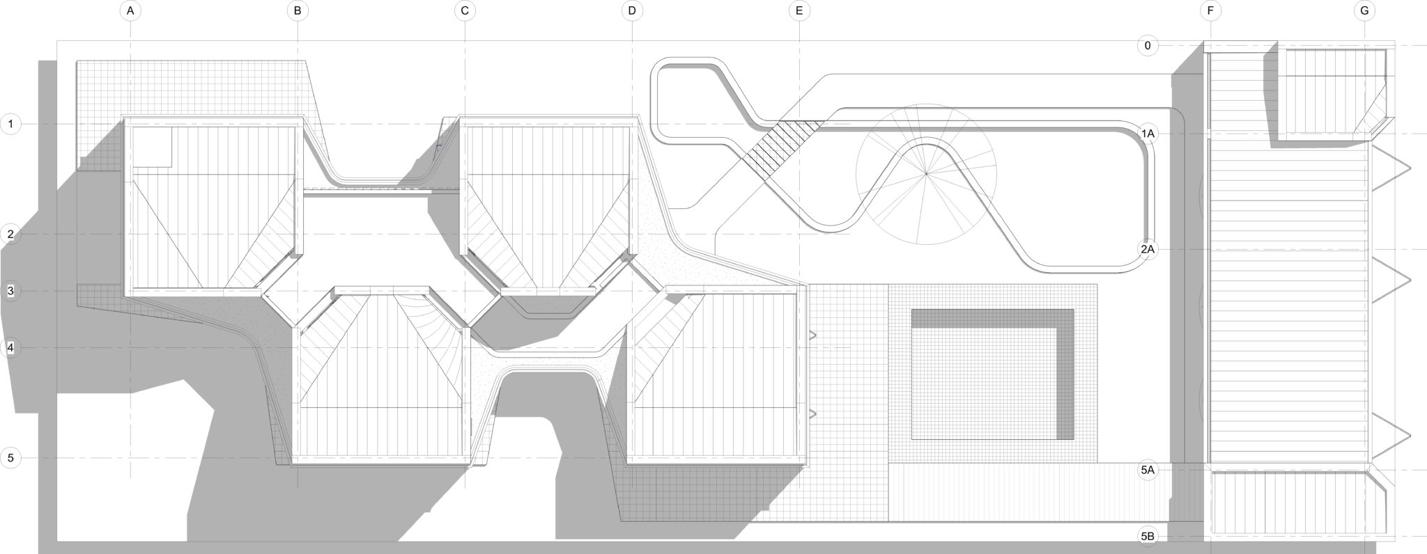 The project organizes the social areas into the first two modules, one of which is the Livingroom that extends towards the exterior and connects with the pool area. Obliquely to the Livingroom, there is the kitchen, which is directly connected to a lateral patio designed to function as an orchard and a common patio shared with the Livingroom. In the subsequent modules of the first floor, at the back of the house, there are two bedrooms that, thanks to the serpentine movement of the hallway, achieve an effective separation from the social area and provide the necessary privacy in the spaces of the home's ground floor. The second floor integrates private spaces, including two additional bedrooms, a studio room, a TV room, and a terrace. This design ensures a functional distribution of spaces and a clear separation between social and private areas.