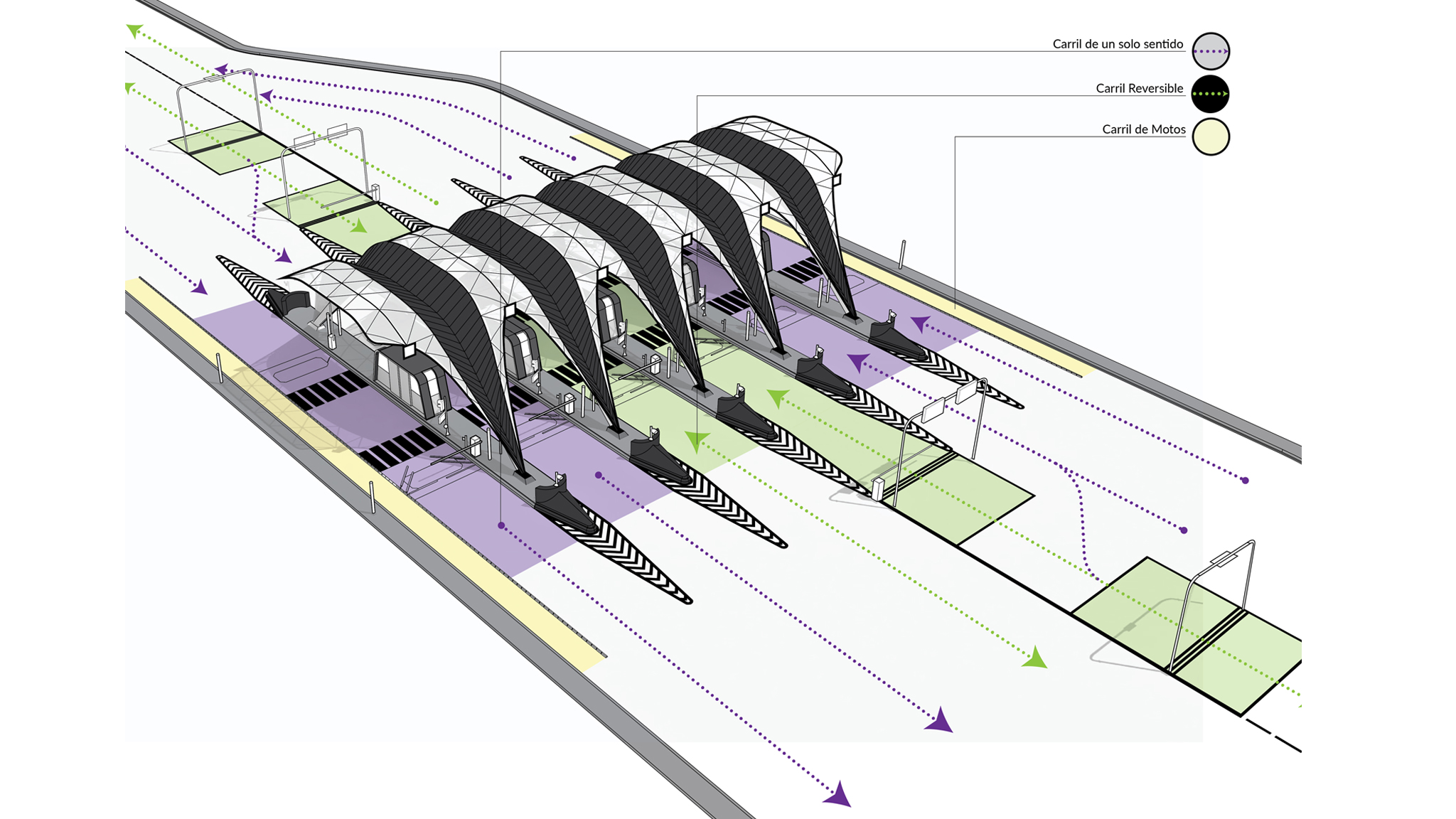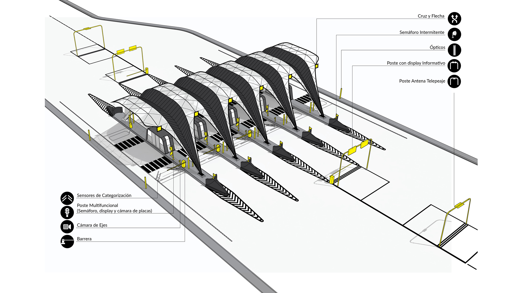 The toll presented here is a concept created for FTS Tecnología, whose main objective is the application of state-of-the-art technological components for a modern and efficient toll. In this sense, the project offers an opportunity to explore an architectural language that reflects the cutting-edge spirit of the technology used. To achieve this, a canopy design is proposed that evokes, through its lines, folds, and rulled surfaces, the movement generated by motor vehicles.